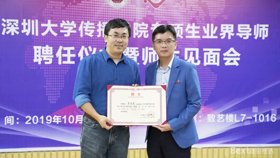 Bexta宝视达是深圳国家影视动漫公共技术服务平台运营单位,拥有国家高新技术企业资质、中国广告企业百强等资质,业务范围辐射全球,整合全球资源,是国内最早提出商业数字化视觉与传播为理念的广告集团企业。此次,Bexta宝视达董事长李志光被学院聘请为专业硕士业界导师,能够指导学生在校掌握的理论工具与解决行业的实际问题相结合,与课堂教学形成良性互补,为广大传播学院的学子们提供丰富的行业知识及业界的资源。