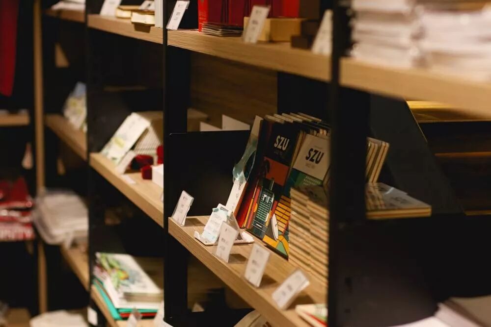 我们这里有各类文创用品,比如本子,笔,帆布袋......还有一些手作首饰店,摆件,生活用品......你还可以买深大纪念品和寄明信片哦。
