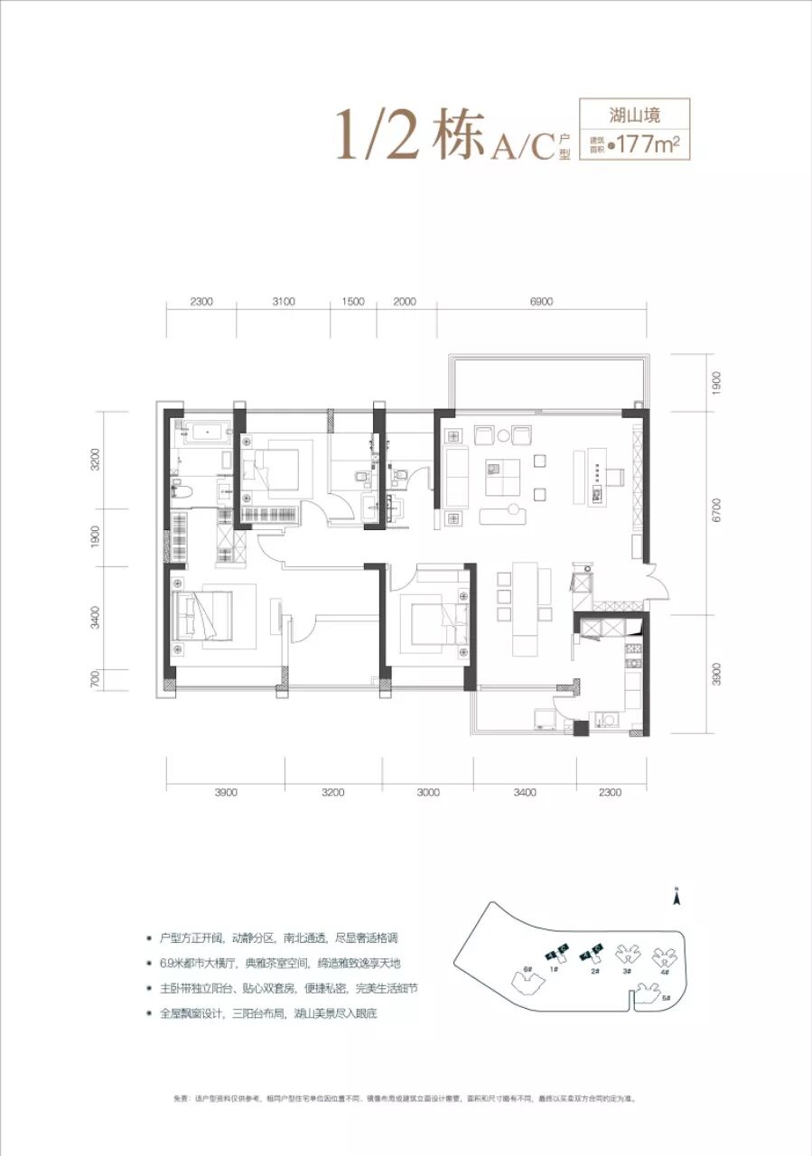 麒麟公馆是住宅地块上的纯居住物业,总建面约14.6万㎡,计容建面约10.54万㎡。住宅建面约10万㎡,其余约5000㎡均为公共配套物业。居住属性纯粹,几乎不会受到商业噪音的影响,在深圳众多的在售及在建新盘中比较罕有。麒麟公馆的商品住宅规划有6栋,地块北侧4栋,南侧2栋,均为30层高。其中北侧靠西的2栋为一层三户,为该项目的楼王单元。为2套建面175-177㎡4+1房及1套建面138㎡3+1房构成;而其余4栋住宅楼为一层六户,以中小面积段的户型为主。大致推算得知,小区共规划有商品住宅约900户。