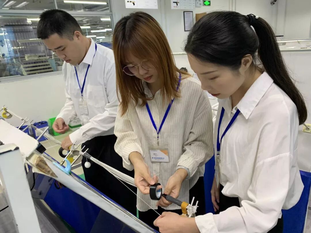 住润电装负责接待的是谢雪峰次长和林雪云副科长。首先来到会议室,林副科长给在座师生们介绍公司概况、人才需求、薪资待遇、职业发展等内容。然后带领师生们前往工厂作业现场进行参观,了解企业环境和产品。还让师生们在新人教育室里参观学习生产流程和作业方法,体验生产过程,现场气氛融洽,开心愉悦。最后返回会议室,同学们按照指引分批进入接待室参加面试。同学们都说等待过程很紧张,面试过程交流愉快。