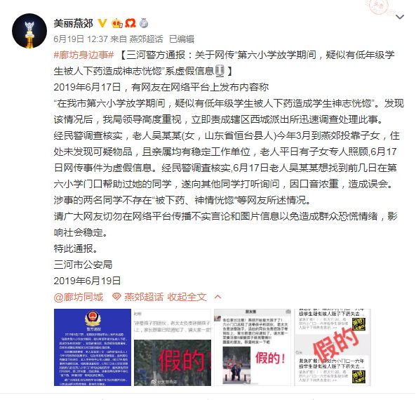 2019年6月17日,他发现在网上发有人散布“第六小学放学期间,疑似有低年级学生被人下药造成神志恍惚”的不实信息,及时向领导汇报,市公安局调查后发布辟谣信息,他及时通过微博发布《三河警方通报:关于网传“第六小学放学期间,疑似有低年级学生被人下药造成神志恍惚”系虚假信息》的贴文,有效防止了虚假信息进一步扩散,避免学校和社会恐慌。“美丽燕郊”发布辟谣信息在全社会产生了强烈反响,累计阅读量达6万多人次。如今在燕郊,群众经常把拿不准的网络消息发给他求证。