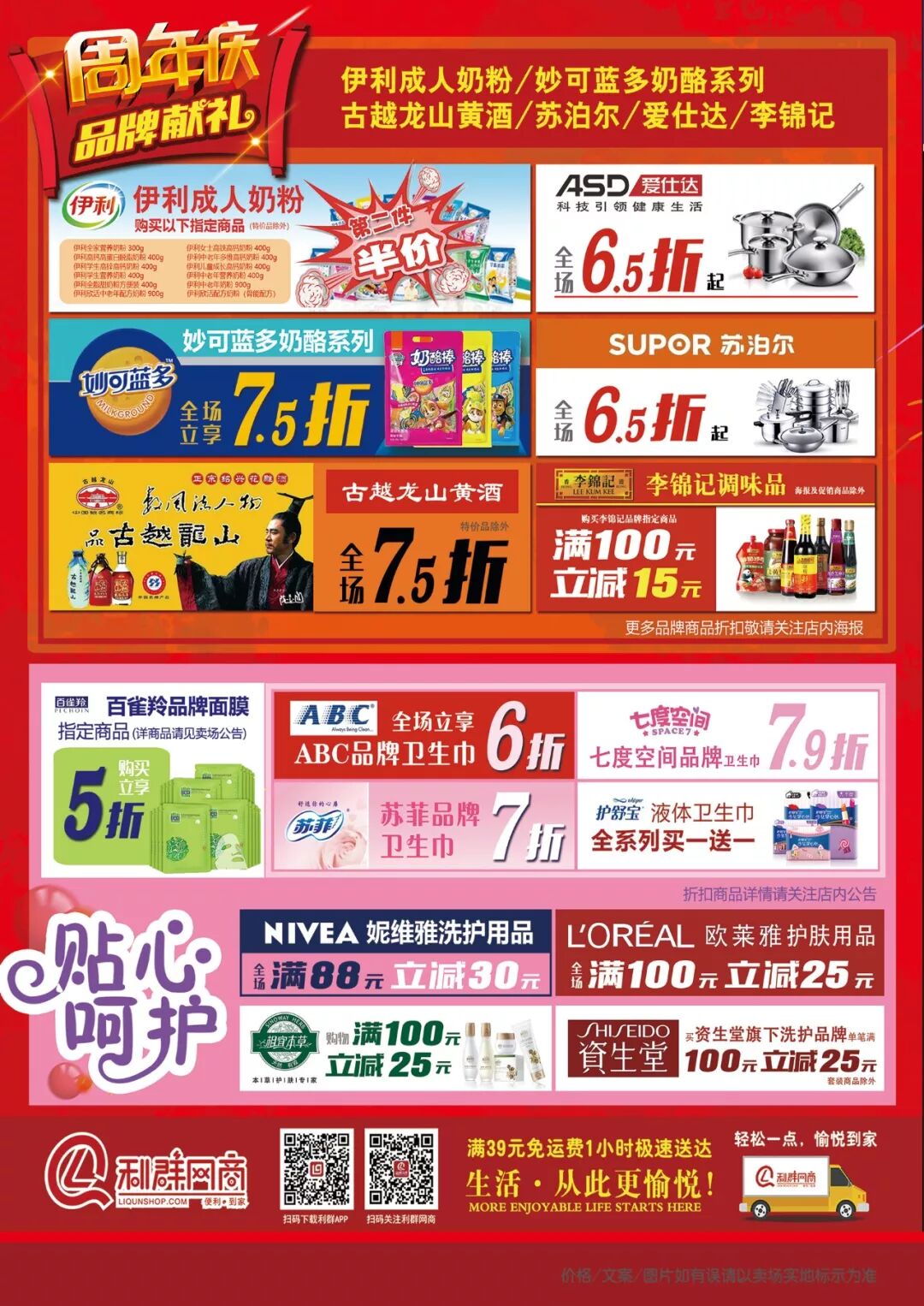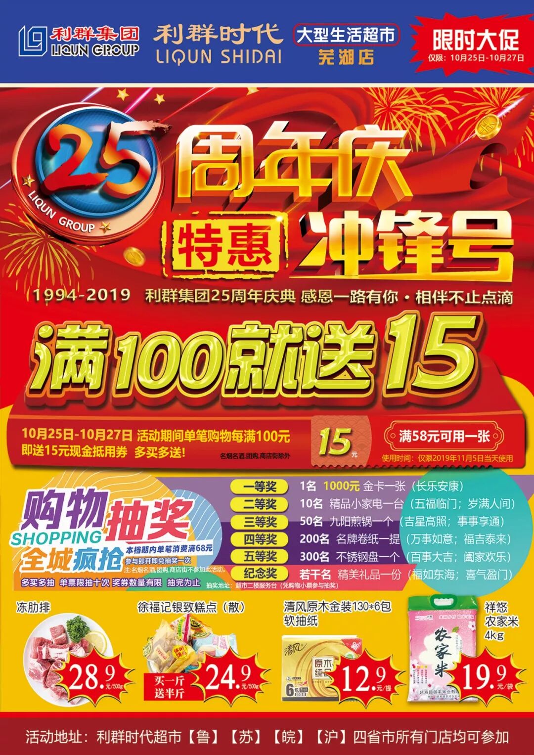 【利群时代芜湖店】利群集团25周年庆,特惠来袭!单笔满100元送15元抵用券!