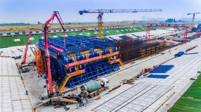 沉管隧道共含10节沉管,为国内首次采用约1300米长距离大规模的双轴线干坞(建于陆地,用以进行沉管预制施工及管节起浮的构筑物)进行预制,且本项目沉管为整体式刚性结构体系管节,采用纵向分节全断面顺序预制。此次浇筑的ES管节长4.924米,高9.2米,宽31.2米,管节侧墙及顶底板厚度为1.25米,中隔墙厚0.6米,钢筋用量为119吨,混凝土浇筑量为461立方米。为保证ES管节混凝土浇筑强度和耐久性,项目部采用定制化开发的ERP信息化管理系统,实现了对工区拌合站和现场浇筑的远程管理,有效保证了浇筑质量和进度,最终顺利完成ES管节浇筑任务。