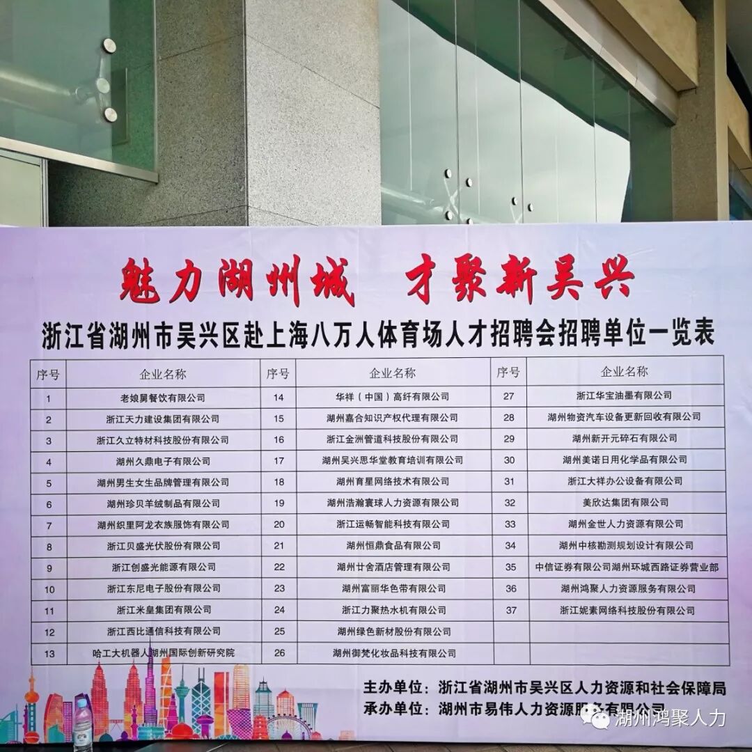 10月26日,由浙江省湖州市吴兴区人力资源和社会保障局主办,湖州市易伟人力资源有限公司承办,在上海八万人体育场圆满举办。