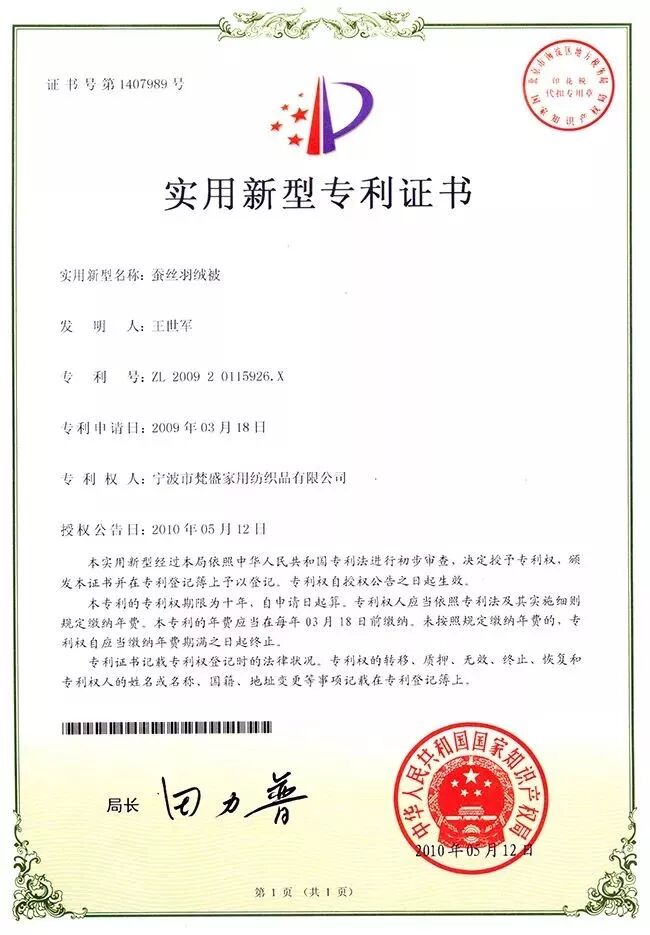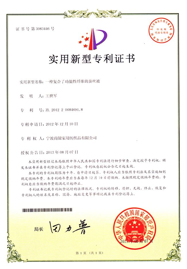 恒源祥家纺尚锦工厂荣获多项国家专利证书