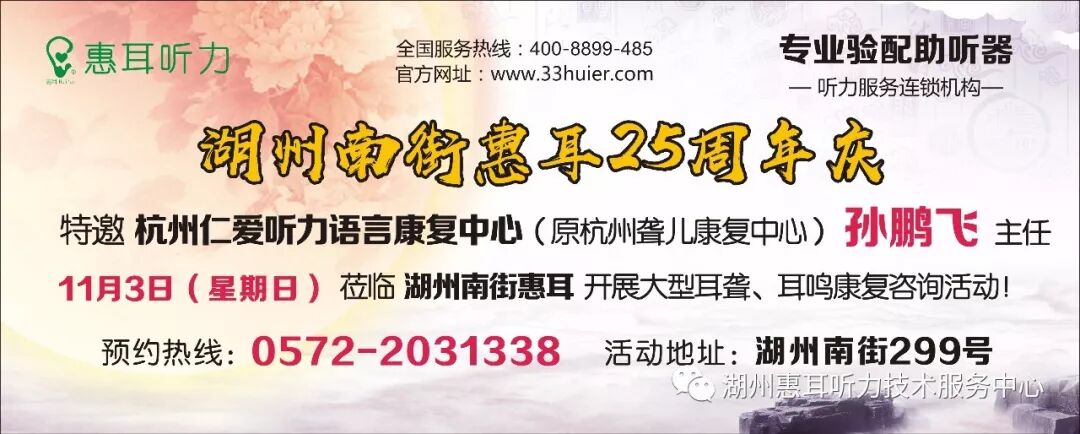 听力损失严重影响人的沟通交流,给人的工作、生活带来了很大的障碍。为了更好的帮助听力损失患者,让听损人士能够聆听的更清楚,湖州南街惠耳听力 特于 11月3日(周日)特邀听力学家 孙鹏飞主任 莅临本听力中心开展耳聋、耳鸣、人工耳蜗咨询,一对一指导验配助听器大型双十一优惠活动!当天双耳选配赠送配件大礼包一份!