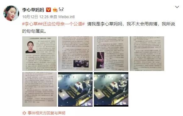 10月12日中午,落水女大学生李心草的母亲发布了一篇名为《一个母亲的血泪控诉:谁能告诉我一个真相?》的贴文,公开了部分监控视频截图,怀疑女儿在溺亡前曾在酒吧遭过搂抱、扇打、欺辱,怀疑女儿醉酒溺水另有原因。