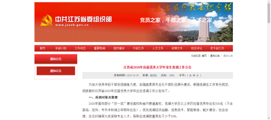 江苏省2020年应届优秀大学毕业生选调工作公告