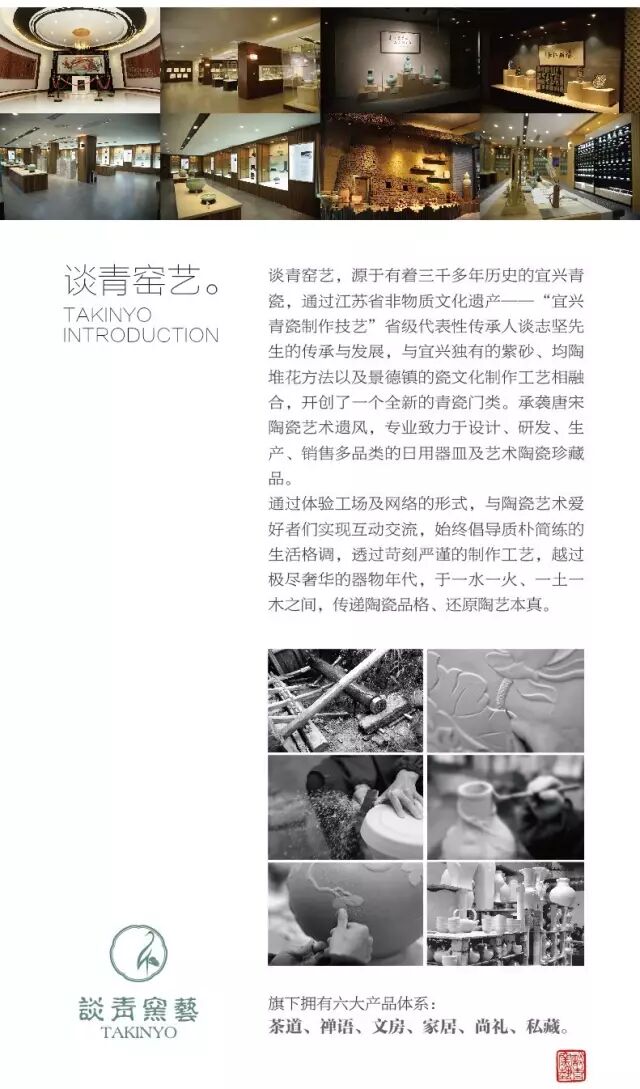 作为江苏省非物质文化遗产的代表性传承人,谈志坚五十年来,在潜心研究宜兴青瓷制作技艺的同时,将紫砂、均陶、精陶、美彩陶及其它制作技艺融入其中,开创了一个全新的陶瓷艺术门类“谈青窑艺”。“窑变斗笠碗、平步青云、枫姿提梁茶具”等作品多次在国家级展评中获得金奖,并被中国美术馆、中华民族艺术珍品博物馆、江苏省工艺美术馆、海南省博物馆、无锡博物院等众多博物馆永久珍藏,使宜兴青瓷登上了全新的艺术高峰——“谈青”时代。