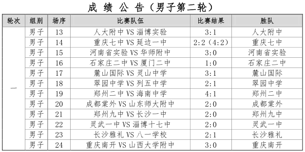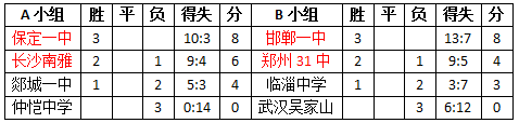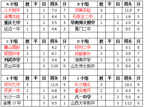 男子组数据三轮小组赛36场比赛共进球96个,平均每场比赛进球2.67个。河南实验、郑州九中和长沙雅礼中学三支球队取得三战全胜。河南实验和郑州九中三战分别进11球,长沙雅礼中学打入10球。河南实验、郑州九中和成都棠外三支球队在小组赛保持“清白之身”可见河南实验和郑州九中攻守平衡,深圳翠园中学和郑州二中只失1球。麓山国际是小组赛中唯一一支逢点球大战都获胜的球队。