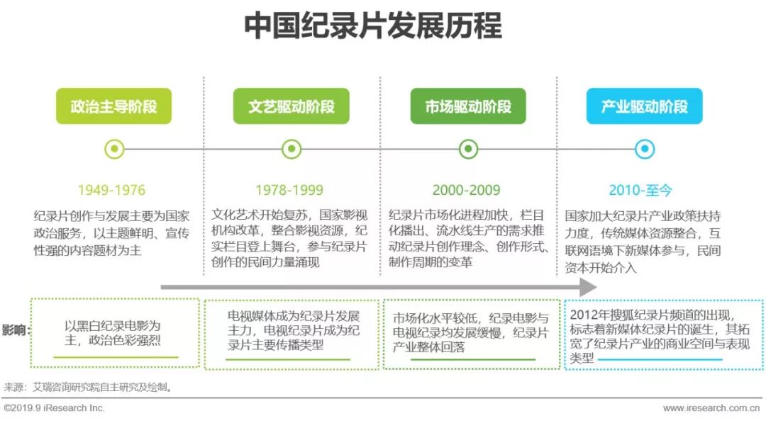 中国纪录片发展历程发展趋势总体向好,进入产业化发展新阶段自改革开放以来,随着社会的变革发展,中国纪录片产业在经济大发展的浪潮中,呈现出偶有曲折,总体向好的发展态势。80年代正值改革开放初期,思想文化禁锢被打破,纪录片作为重要的影像文本,成为文化艺术领域重要的表达形式。90年代纪录片开始进行市场化探索,国家影视机制改革与主体积极参与交织并行,推动纪录片形成第一次创作高峰。21世纪初,电视栏目化与市场化要求与纪录片制作理念/周期的矛盾,导致纪录片产业发展整体回落。2010年至今,随着国家相关政策扶持,互联网介入,纪录片出现“微纪录”、“新媒体纪录片”等新纪录片形式,拓宽了纪录片发展空间。