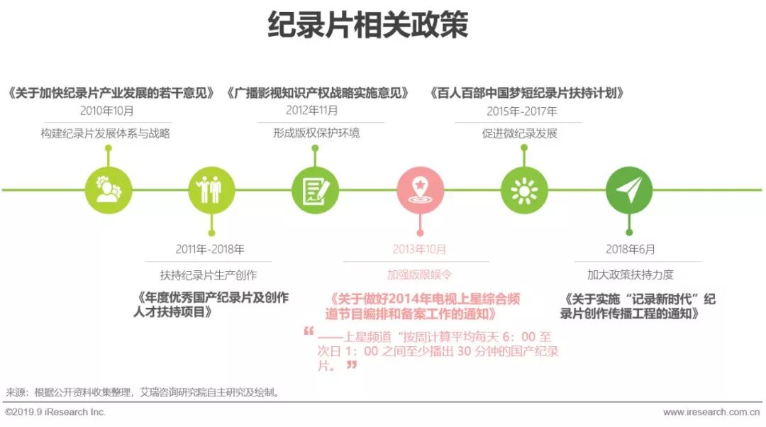 政策驱动:政策造就巨大内容缺口,推动上游制作端快速成熟2010年广电总局下发《关于加快纪录片产业发展的若干意见》,提出了纪录片产业发展的总体要求与主要任务,构建了纪录片整体市场体系及发展战略。2013年,“加强版限娱令”下发,大大加快了纪录片产业化的速度。一方面,《通知》在限制娱乐节目的播放,无形中拓展了纪录片的竞争空间。另一方面,《通知》要求上星频道“按周计算平均每天 6:00 至次日 1:00 之间至少播出 30 分钟的国产纪录片”,在当时纪录片产量有限的情况下,创造了极大的内容缺口,从而使得民营企业、新媒体平台纷纷加入上游制作端,推动了上游生产端的快速成熟。