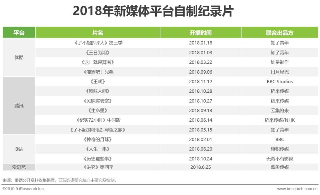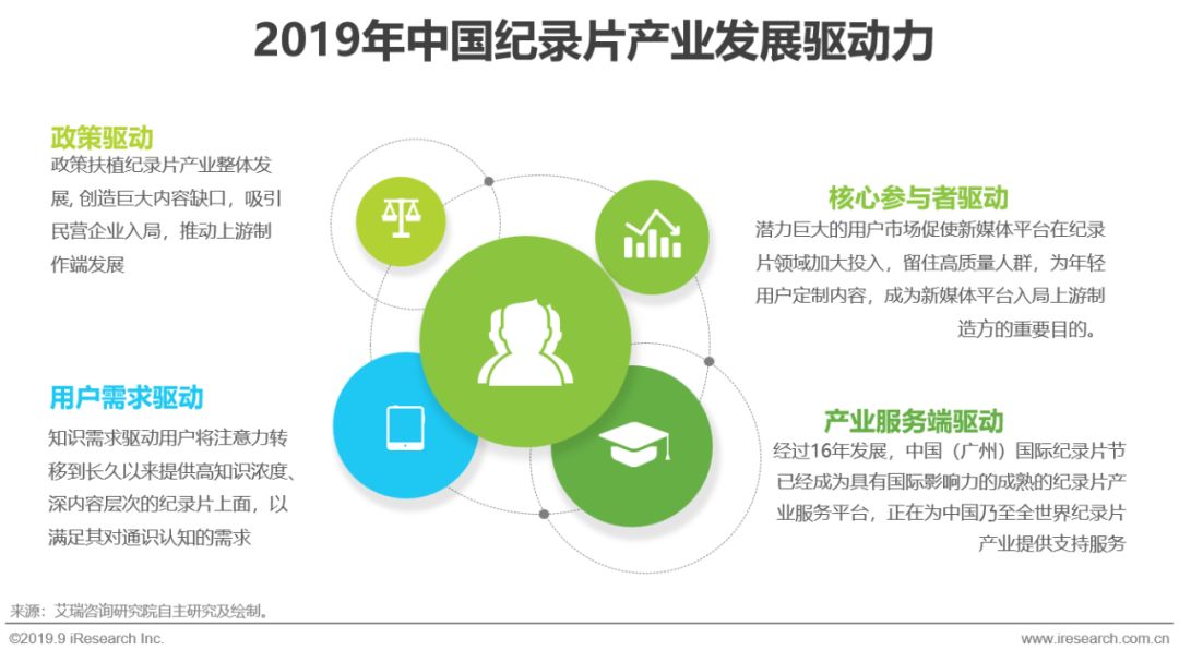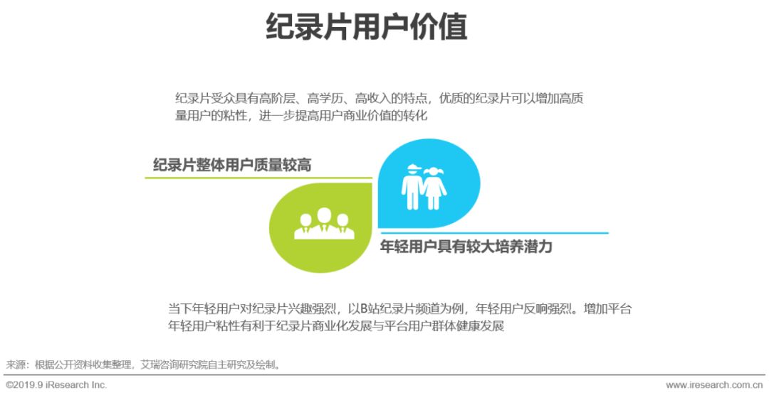 核心参与者驱动:新媒体平台加大纪录片投入,用户市场价值潜力巨大潜力巨大的用户市场促使新媒体平台在纪录片领域加大投入,留住高质量人群,为年轻用户定制内容成为新媒体平台入局上游制造方的重要目的。一方面,纪录片受众整体质量较高。去年《风味人间》尝鲜会上腾讯视频总编辑王娟透露,纪录片用户整体画像以男性为主,高于大盘15%左右,无论职业特点、收入特点、内容品味上,均是平台质量最高的用户,当有《蓝色星球2》《大猫》等头部作品出现时,用户比例会从10%上升到15%-20%。另一方面,年轻用户有较大培养价值。根据B站2017年招股书显示,其82%的用户都是出生于1990-2009之间。当下纪录片成为B站最受欢迎的频道之一,足以当下年轻用户对纪录片拥有浓厚的兴趣。为吸引年轻用户,腾讯视频2019年推出《风味人间2》《宵夜江湖》《潮city》《决胜!无人机》等纪录片,紧扣当下年轻一代物质条件优越,有较好的审美基础和对世界充满好奇与求知欲的特点。