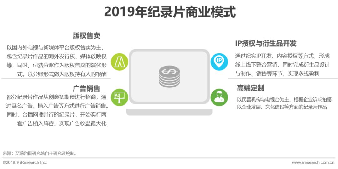 中国纪录片商业模式盈利模式多样,广告销售仍是主要收入来源总体来看,近些年的市场化运作使得相当一部分观众能够接受付费观看,社会资本的介入一定程度上拓宽了纪录片的商业空间,为纪录片生产提供了必要的资金支持,纪录片盈利模式得以呈现多元化发展,主要以广告销售、版权售卖、IP授权及衍生品开发等为主,但广告销售仍为主要收入来源,收入占比一般超过50%。同时,电视台因其资历与经验丰厚,为企业进行高端定制纪录片也成为其一大盈利来源。相比于其他类型作品,纪录片商业化能力较弱,一定程度上限制了纪录片产业化、市场化进程。随着互联网与纪录片融合程度不断加深,丰富纪录片盈利模式,开拓多元化收入渠道,具备更多的想象和创新空间。