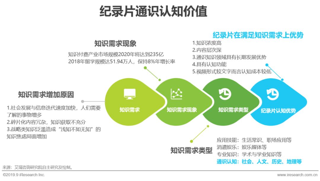 用户需求驱动:知识需求增加,纪录片认知价值正被挖掘随着社会发展速度加快,新鲜事物增多,人们对知识的渴求程度越来越高,而自媒体的发展一定程度上造成了知识碎片化、空泛化的局面产生,进一步造成用户知识焦虑的情况。在应用技能、消遣娱乐、专业知识、通识知识四大知识需求维度中,前三者均有一定的内容供给,而在通识认知领域存在一定的发展局限性,一方面,通识认知驱动培训机构的动力不足,另一方面,内容付费领域在内容深度方面略显乏力。纪录片依托长期的发展优势,在知识浓度、内容层次、以及体裁形式上有较大优势,逐渐成为用户满足通识认知需求的主要途径,纪录片的认知价值正逐渐显现。