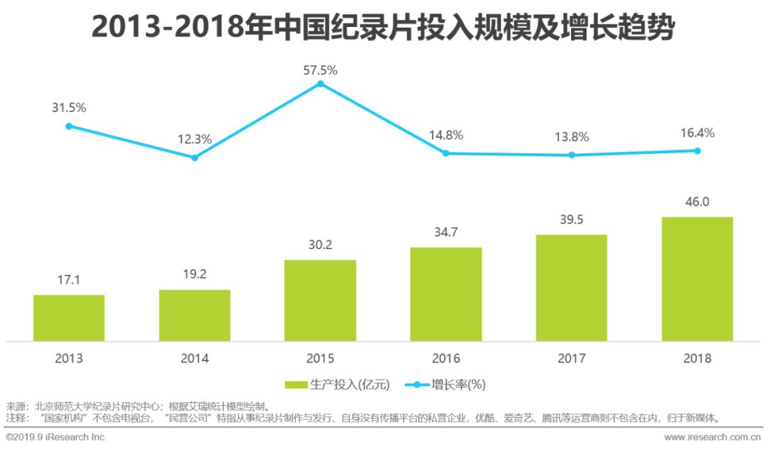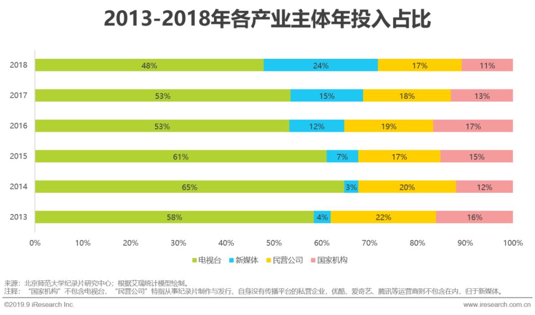 纪录片产业投入规模投入规模增长放缓,新媒体投入占比上涨2013至2015两年间纪录片产业投入规模高速增长,2015年年增长率高达57.5%。近三年来实现平稳发展,2018年增长率达到16.4%,近三年市场规模增长率均保持15%左右。一方面,制播分离制度推行较为顺利,纪录片市场化程度加深,民营公司制作程度增加,经费成本得以有效降低;另一方面,尽管近三年是新媒体高速发展的时期,从2016年占总投入规模的12%到2018年达到24%,实现了翻倍增长。但电视台呈现两极分化现象,部分纪录栏目盈利较为困难,商业化道路发展缓慢,致使部分地方台与卫星频道在纪录片上投入减少。