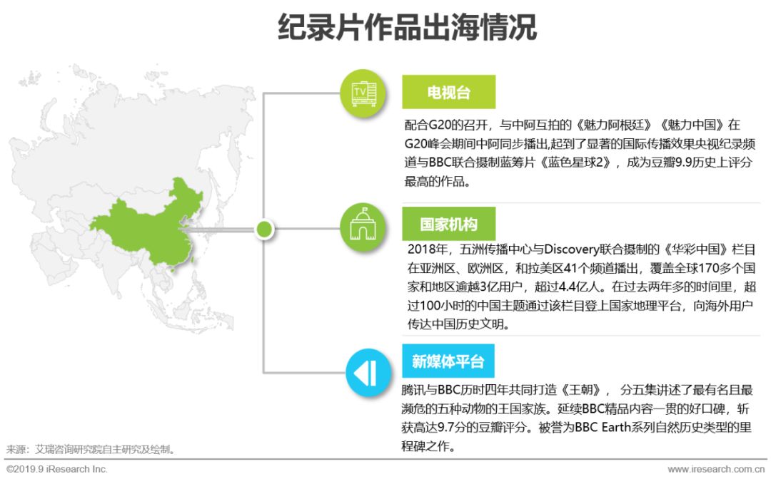 随着我国国力与国际影响力的增强,对外宣传国家形象已成为重要的议题。国家电视台正在积极制作、推广符合国际传播的中国纪录片;同时,新媒体也在国际传播方面协同发展向世界传达中国古老而悠久的历史文明与现代化建设的发展进程。来源:艾瑞咨询