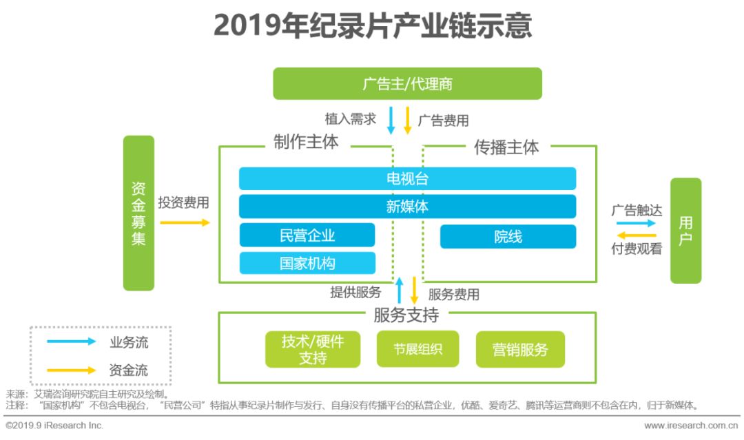 纪录片产业链形成电视台为主力,新媒体为重要支撑的产业格局经过近十年的发展,中国纪录片产业链已经逐步清晰,涉及纪录片创意、资金募集、制作、市场推广、播放等流程,形成多种产业主体参与的产业格局。纪录片资金来源主要有政府补贴、基金投资、制作方投资、社会众筹等方式;制作主体与传播主体沿着产业链相互延伸,往往形成角色交叉,主要为电视台、民营公司、国家机构、新媒体机构。此外,电影院线也是主要传播主体之一;广告代理商是纪录片广告合作的主要对象,营销服务商主要负责纪录片营销策划及市场推广;技术/硬件厂商提供相关支持服务,产业服务组织则对纪录片产业发展起到重要支撑作用。