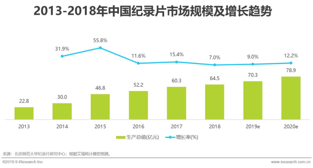 纪录片产业市场规模进入稳定增长阶段,2020年市场规模将突破78亿2013-2015年实现纪录片市场快速增长,得益于政策扶持与市场化的助力,纪录片市场规模迅速扩张,从22.8亿攀升至46.8亿,每年市场增长率保持在30-50%。随着互联网对用户注意力的争夺导致电视行业发展趋于平缓,一定程度上对纪录片市场造成影响,而互联网与纪录片的结合尚待进一步发展。从2016年至今,纪录片市场进入稳定增长阶段,每年市场增长率保持在10%左右,预计在2020年市场规模将突破78亿。