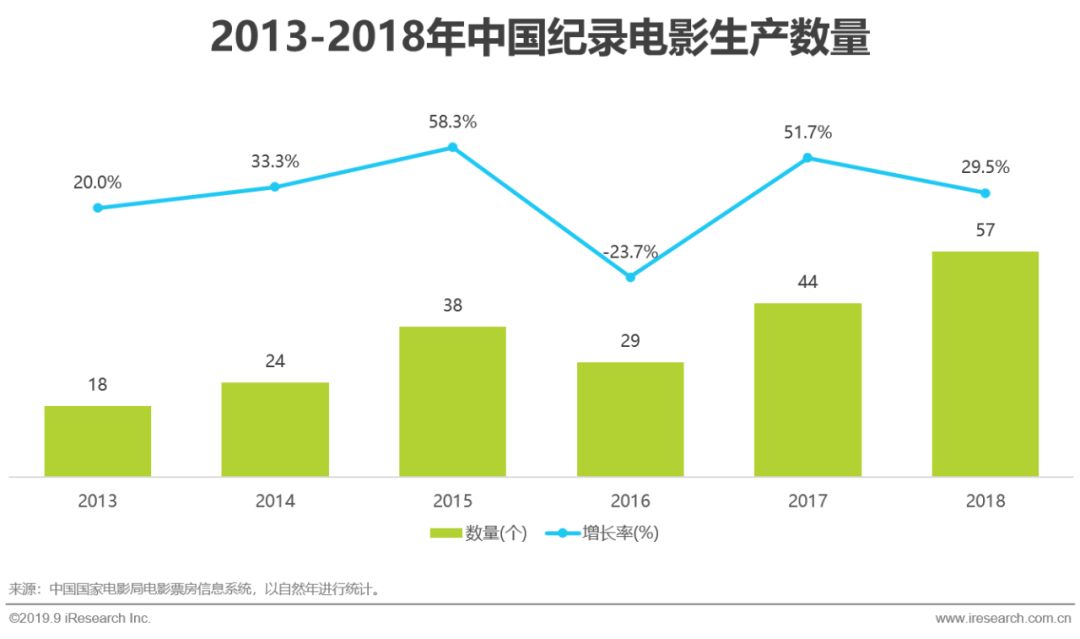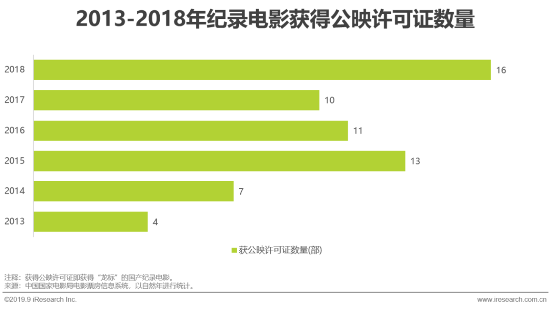 纪录电影制作与公映数量上涨显著,整体仍需积蓄力量纪录电影已经成为中国纪录片业态中的重要一环,从2014年以来出现高速增长局面。受2017年纪录电影市场爆发的影响,2018年纪录电影产量和供公映数量均有所上升。民营公司纷纷试水纪录电影,2018年57部新片中超过70%由民营公司出品。对比美国2018年共生产纪录电影142部,是中国纪录电影年产量的2.5部,我国纪录电影在制作数量上与纪录片成熟国家仍有较大差距。从公映许可数量来看,2018年合计有16部电影公映,新片占比高达56%,与2017年前老片占大部分比例的现象有所改观,但整体基数过小,在新的发展周期中仍需积蓄力量。