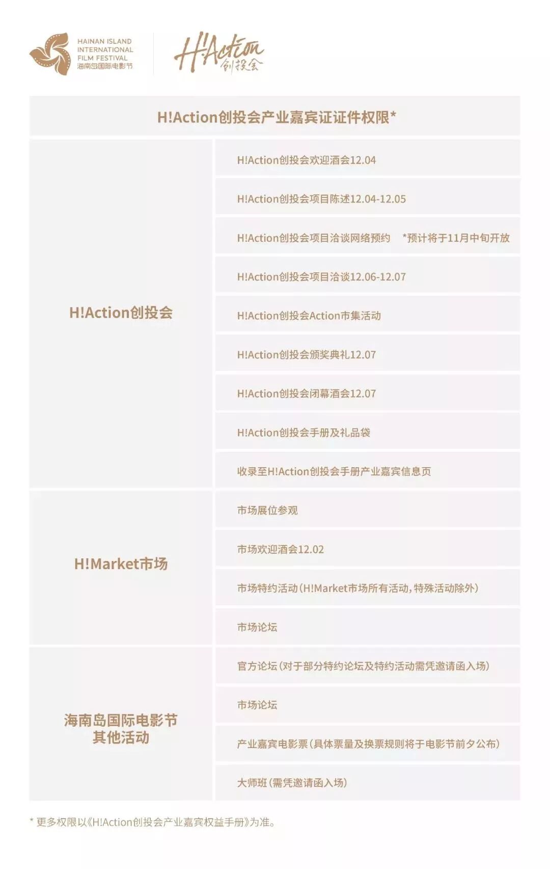 注册成为H!Action创投会的产业嘉宾会得到电影节定制的身份证件。届时可参加包括电影节欢迎酒会及主题论坛在内的H!Action创投会所有主体活动。同时,所有参会产业嘉宾均有机会获得电影节期间的展映活动观影券。