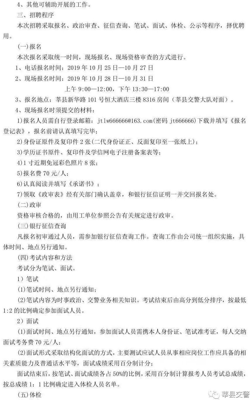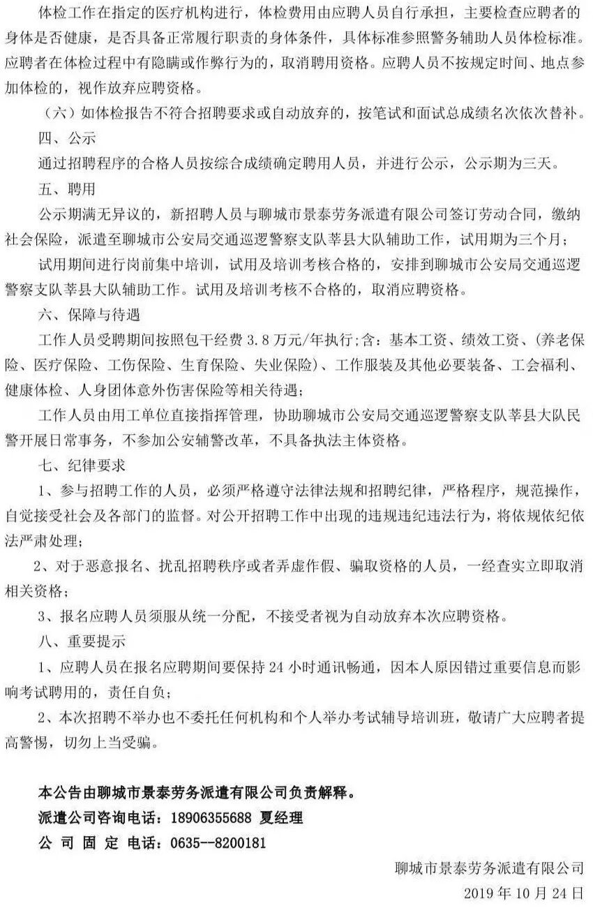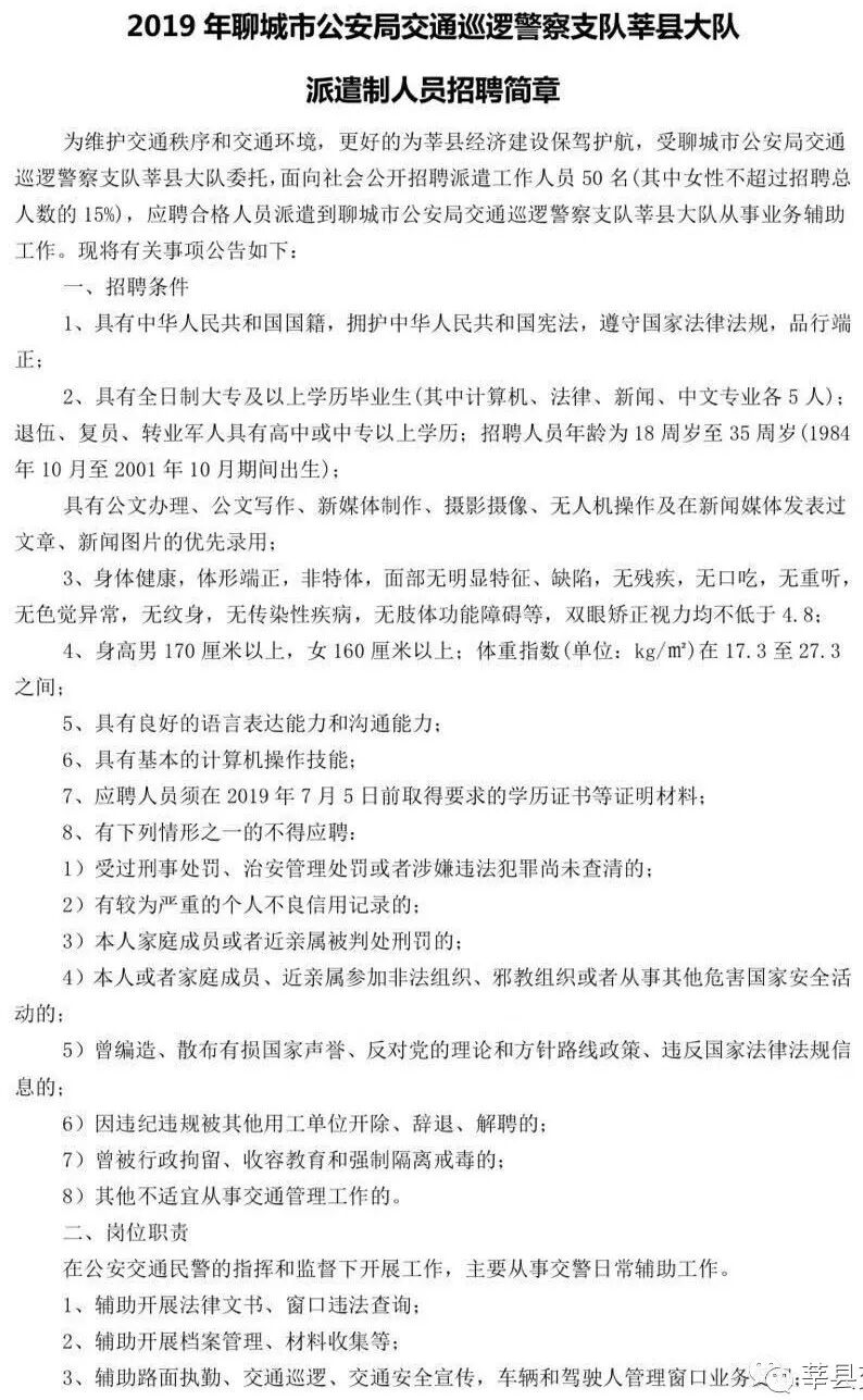 2019年聊城市公安局交通巡逻警察支队莘县大队发布派遣制人员招聘简章(50人)报名时间:2019年10月25日-10月31日