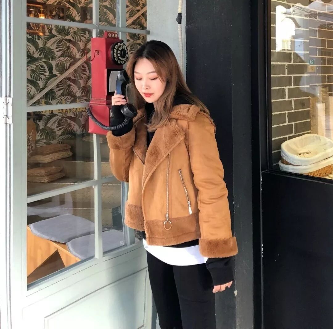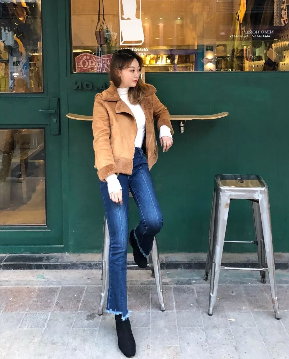 这个鹿皮绒短款外套搭配阔腿牛仔裤