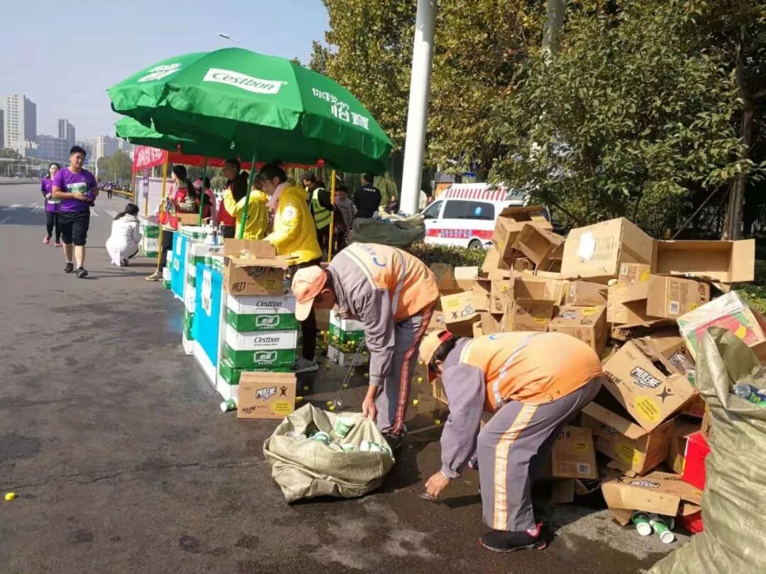 在大部分跑者通过之后 环卫工人正在紧锣密鼓清理纸杯
