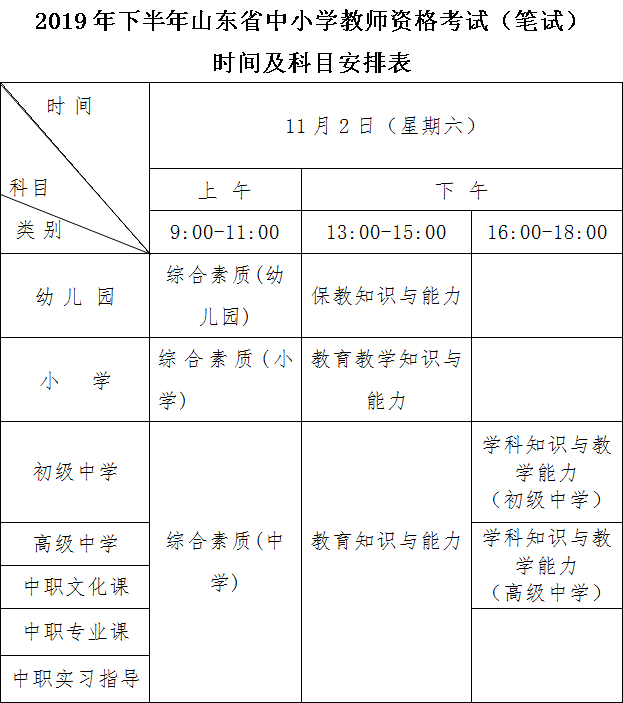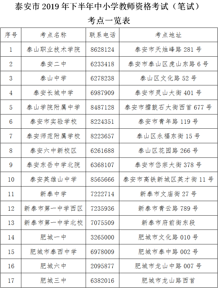 2019年下半年中小学教师资格考试(笔试)定于11月2日进行。我市设考点17个,其中泰城考点10个,新泰市考点3个,肥城市考点4个。