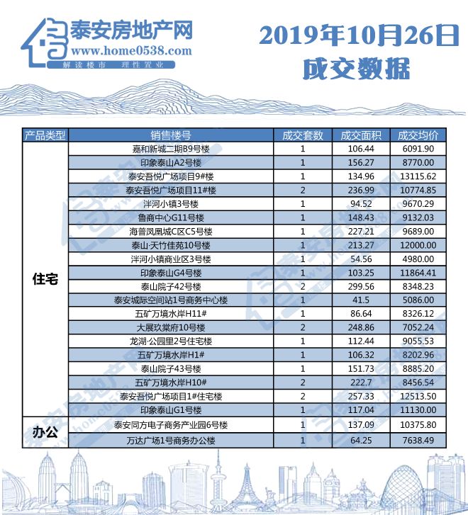 【泰安房地产网讯】据本站不完全统计,2019年10月26日泰安市共成交商品房27套,其中住宅网签25套,办公网签2套,与10月25日相比,环比下降67.86%。