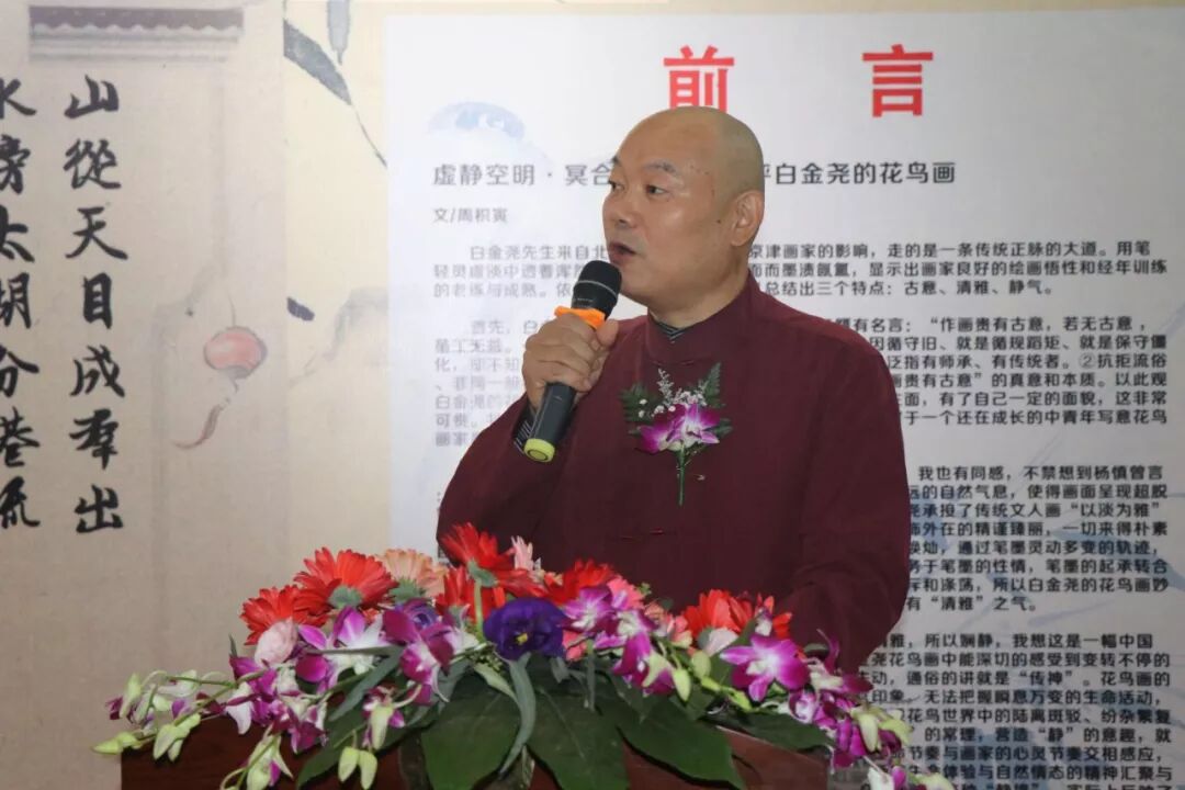 中国美协理事、河南省文联副主席、河南省美协主席刘杰先生发来贺词,由郑州市美协办公室主任孟超宣读 刘杰主席在贺词中说:白金尧先生是我省著名的花鸟画家,几十年来笔耕不辍,坚持创作。秉持一手深入传统,一手深入生活,他汲取了宋元文人画的审美意蕴,注入了道法自然写意写心的优秀文化品格,集众家所长,逐渐形成了简约疏朗,清新淡雅的绘画风格,多幅作品在全国各类展览中入选获奖。为己、为市、为省争得了荣誉。特别是他在担任郑州市美协主席之后,积极团结带领省会美术家举办的一系列较有影响的美术展览和活动。为提升郑州城市的影响力,丰富省会人民群众对高水平的艺术需求及河南更加出彩,都做出了积极的贡献。