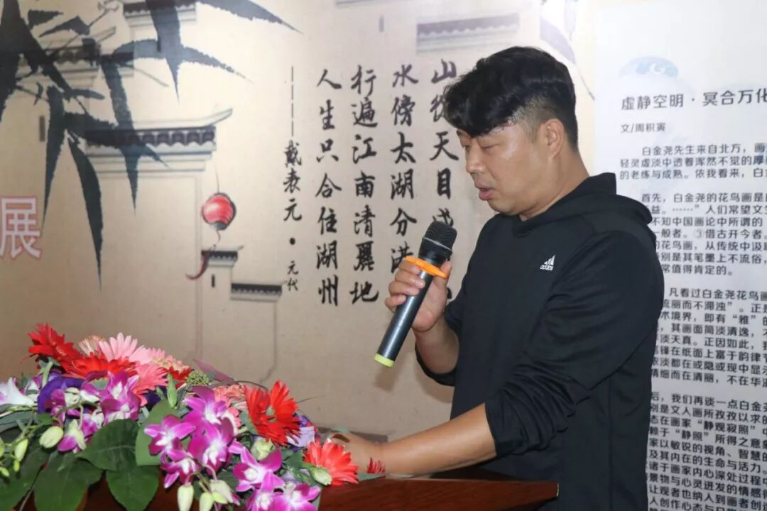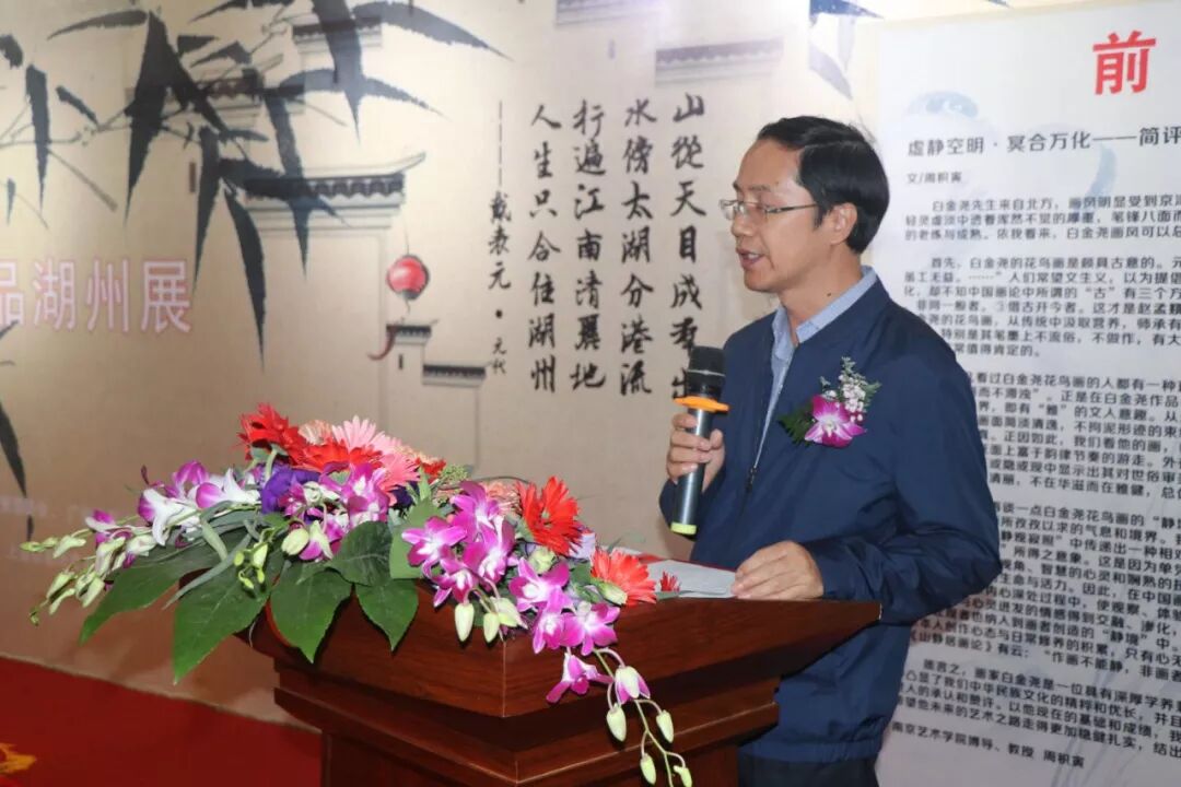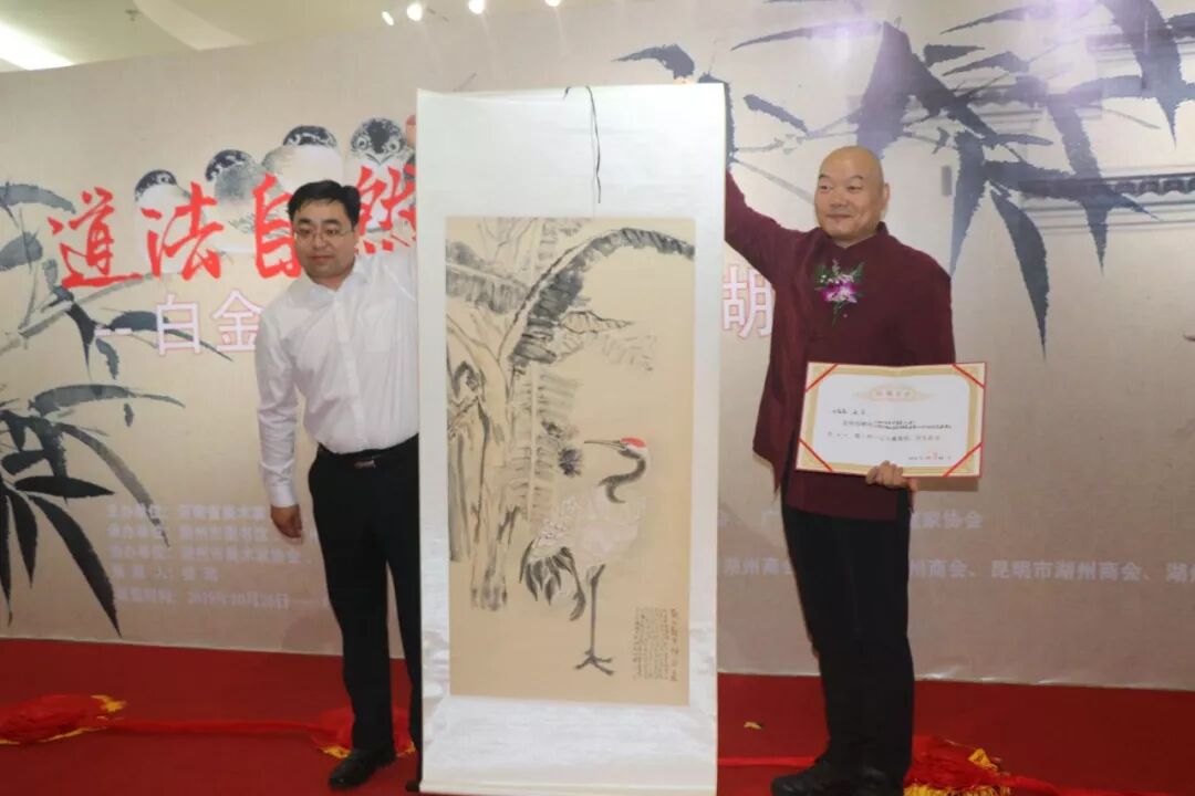10月26日上午,由河南省美术家协会、湖州市文学艺术界联合会、湖州图书馆、广州华厦美术展览中心有限公司等单位主办的庆祝中华人民共和国成立70周年“道法自然——白金尧花鸟画作品展”在湖州市图书馆展厅开幕。
