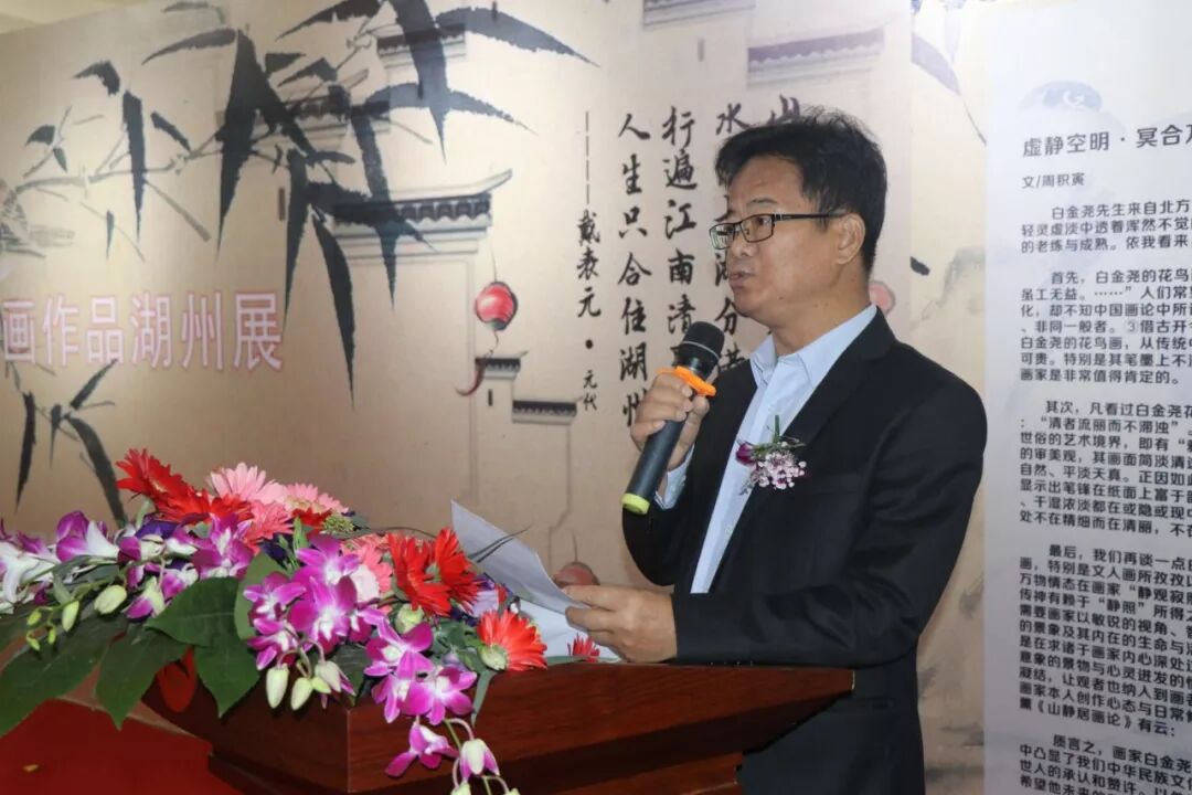 湖州市文联主席沈宝山先生致辞 湖州市文联主席沈宝山先生对白金尧高古清雅的艺术风格赞扬有加,他希望以后湖州郑州两地加大文化艺术交流,多举办这样有意义的画展,丰富人民群众的文化生活。