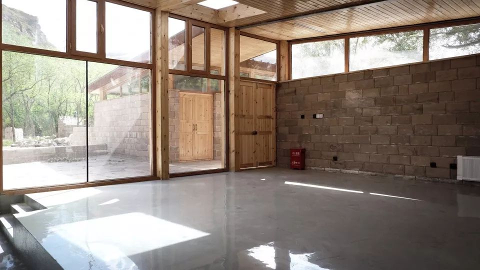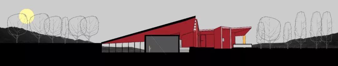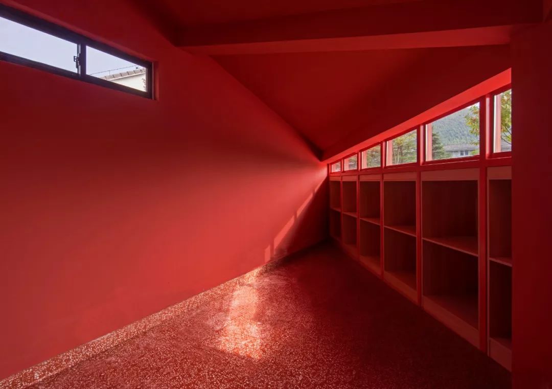 从材料上寻求色彩对比成为实现这一意图的契机。红色是具有感染力的色彩,他带有明显的情绪性倾向,红色陶砖作为屋面,红色钢制幕墙体系作为表皮,红色水磨石作为地面,这一系列差异的红,让红色超越色彩,与远处的青山呼应,而青山也在红色建筑的映衬下显现出来。