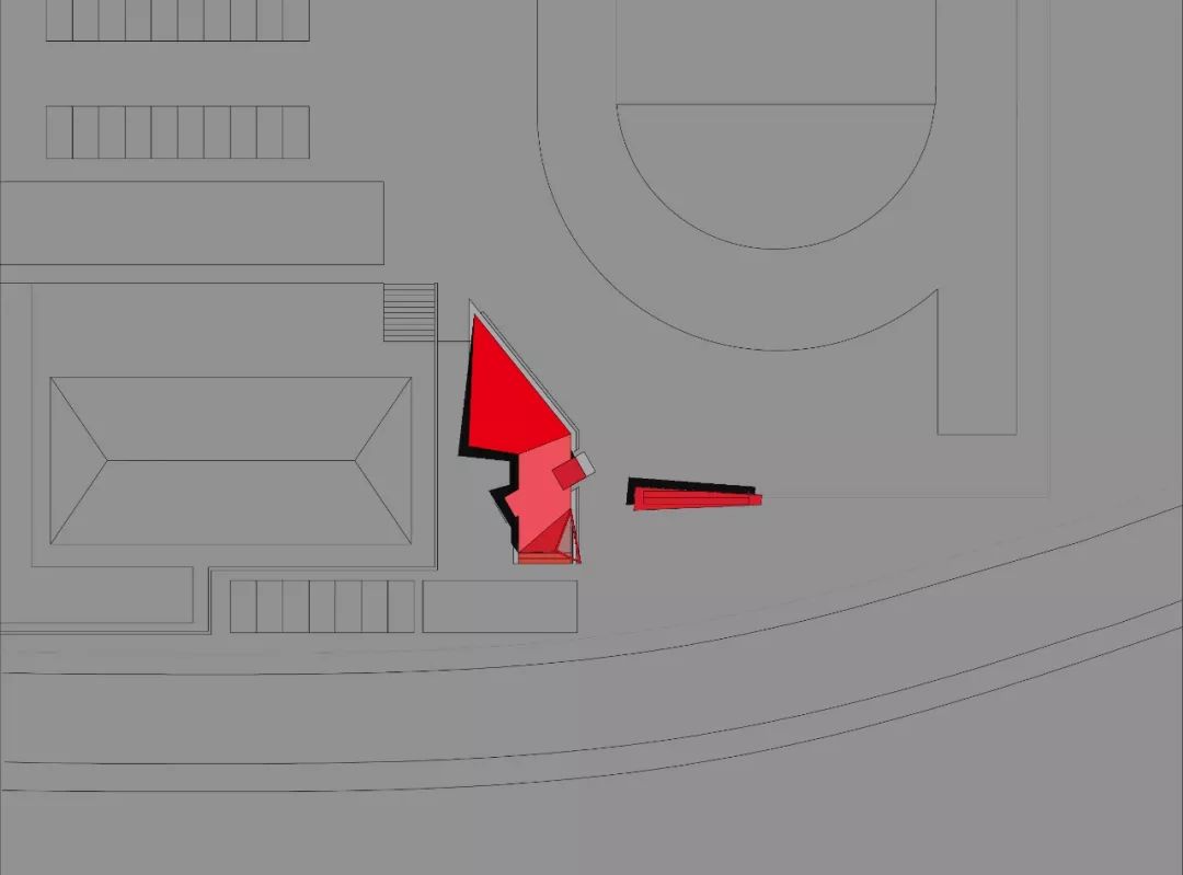 乡邻中心的基地虽小,但却位于一块复杂的三角形地块上,北侧是L型的四层楼政府办公楼,围合成政府大院,但是却比乡邻中心的基地高出三米,南侧是一条斜向的道路和其它的几条主干道组成Z字型的上坡。东侧则是一条死胡同,紧贴着民居。