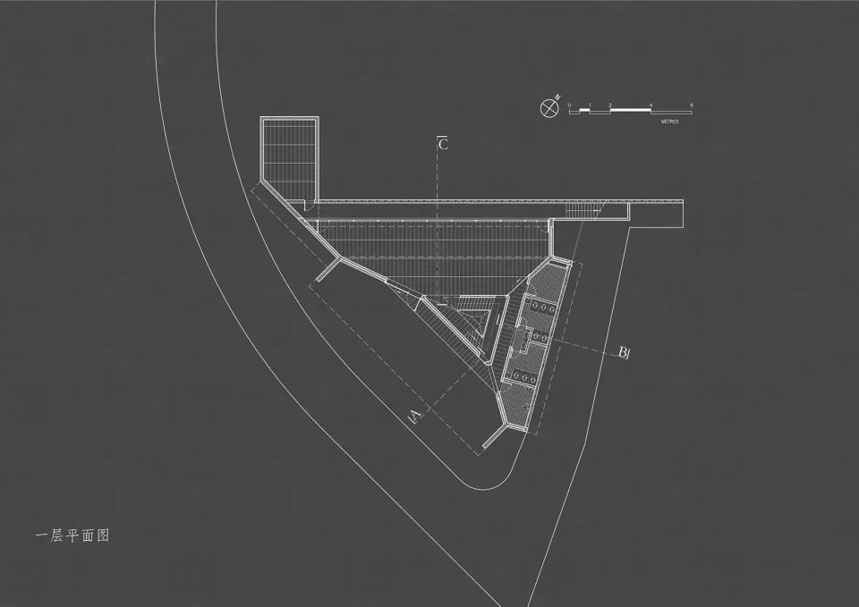 从南侧的道路看,设计师希望能把建筑体量抬起,不仅为地面停车和进入建筑留出足够的空间,更重要的是水平的二楼体量腾空于斜向的山地道路,其对比可以揭示场地的特征。