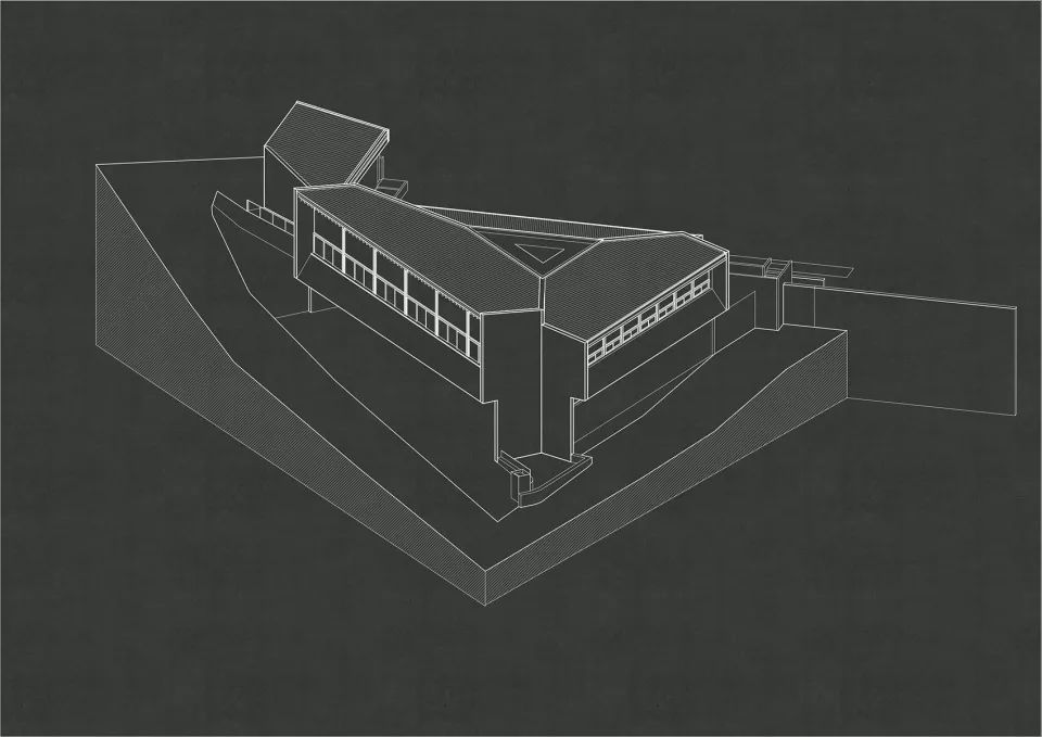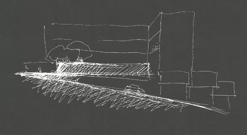 屋檐压低到人的高度以下,暗示其入口的隐蔽性,向上的坡屋顶将人的视线引向远方的群山;25米跨度的大梁和场地若即若离,犹如Castagno的白桌面横穿过整个视线。
