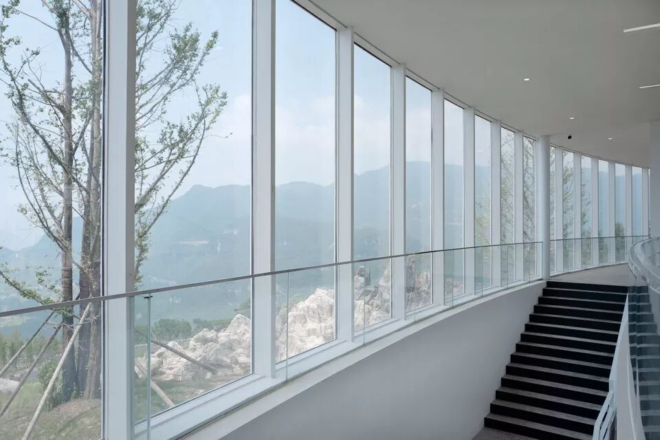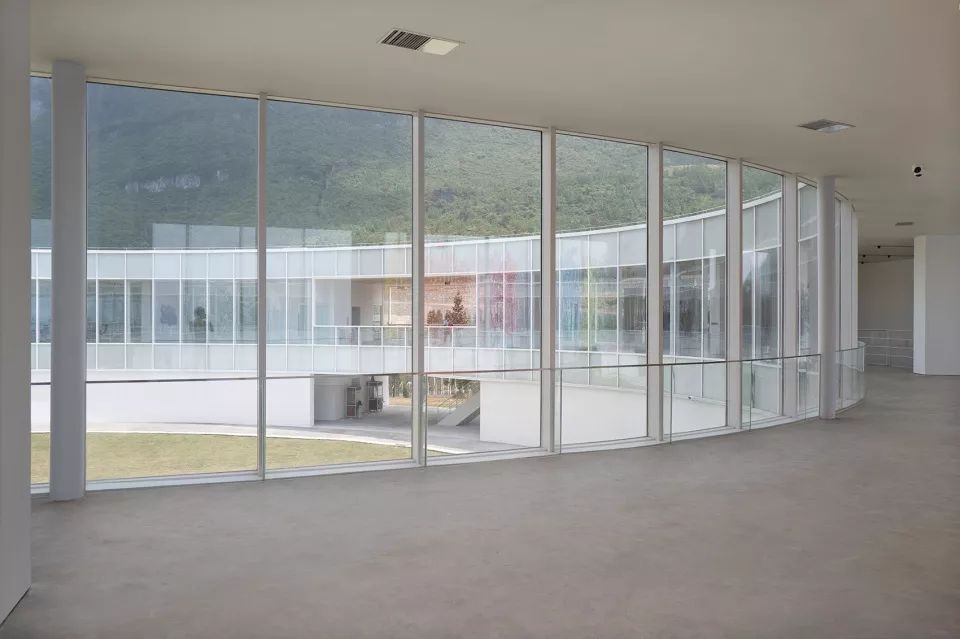 椭圆环形主展厅使用了大片的玻璃幕墙,人们在欣赏大地艺术作品的同时,可以从360度方向感受山中风景,赶上起雾的天气,如同漫步于云雾中,更能够获得完全置身于自然之中的体验。