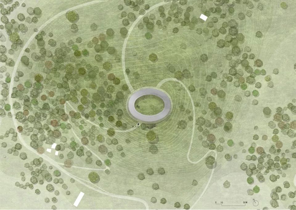 为了回应大地艺术的主旨,建筑师设计了一个椭圆环形主展厅,由入口接待、员工办公、商店和特别展示等4个功能体块将其托起,并利用山势消解掉首层的体量感。