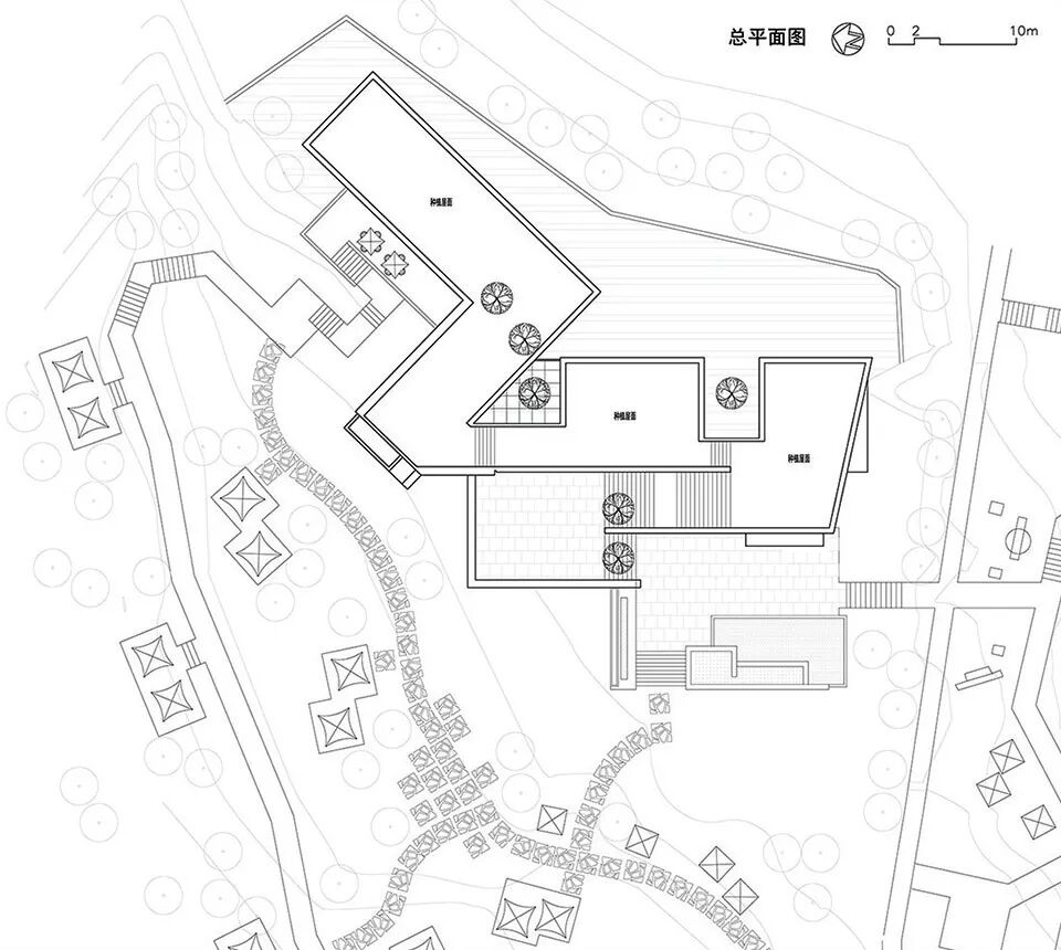 建筑形体和布局依据地形的起伏和高差变化而自由展开,对场地特征的尊重本身就是一种抽象的“拟态”。箱型的几何形体被设置在不同的高差平台上,但应功能的要求又被联接为一个连续变化的整体,如同山间的几块巨石,“随意”地搁置在场地上,自然而又多变。