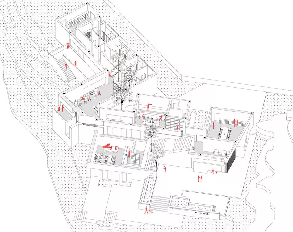 通过首层功能体块分隔出的灰空间,人们可以随意进出中心庭院,如同穿梭于自然之中,模糊了建筑的界限,也减少了其对自然和人的压迫。