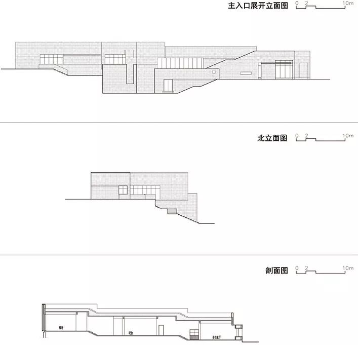 由于美术馆的预留建设用地位于一个微耸的山坡上,照顾来访者处在不同高度时对建筑形体的感受显得尤为重要。