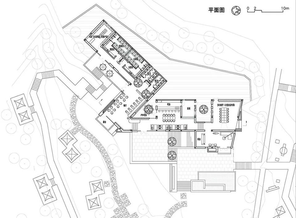 室外平台可休憩,观景和品茶,同时大平台又是入口广场向屋顶花园的过渡部分,这一过渡空间因为地形高差的原因,相互的连接转换十分自然。