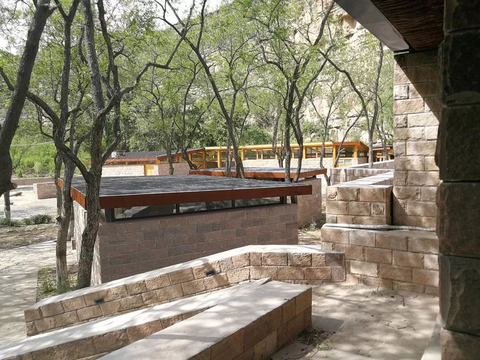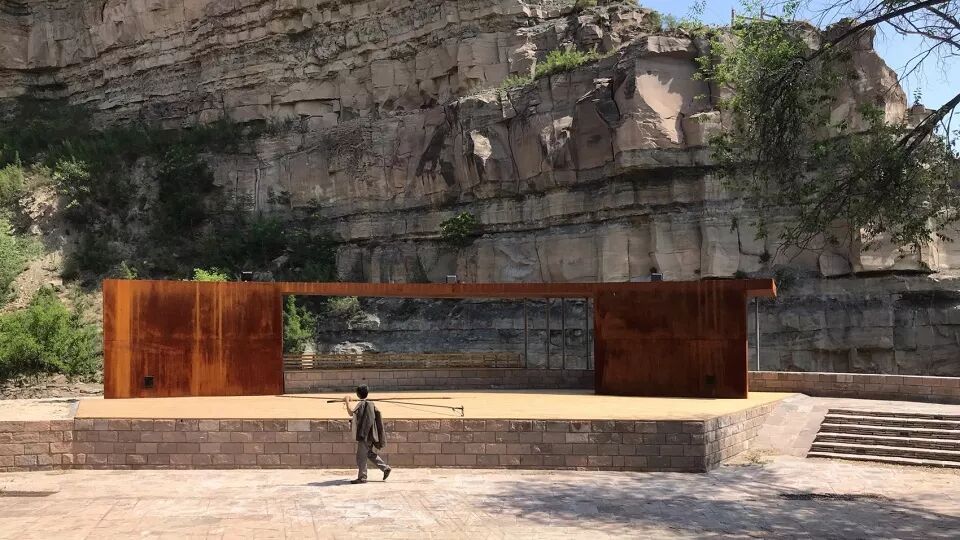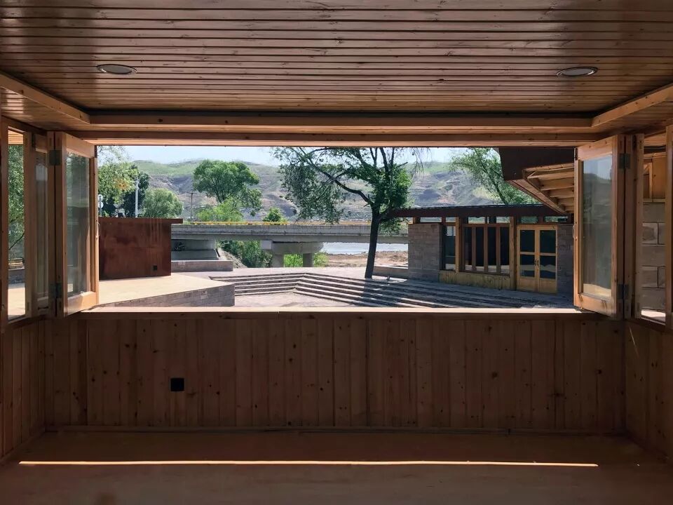 高台茶室、观景餐厅、大灶厨房大小数间,离合相间、随势高低、曲折为院。院中石阶剧场、石堤戏台自成一体,槐荫当庭、崖壁为屏,虚实相生。借黄河崖壁的壮阔背景及滨水河道的自然风光,闲散天地间,再造一处‘北方山水聚落’”。
