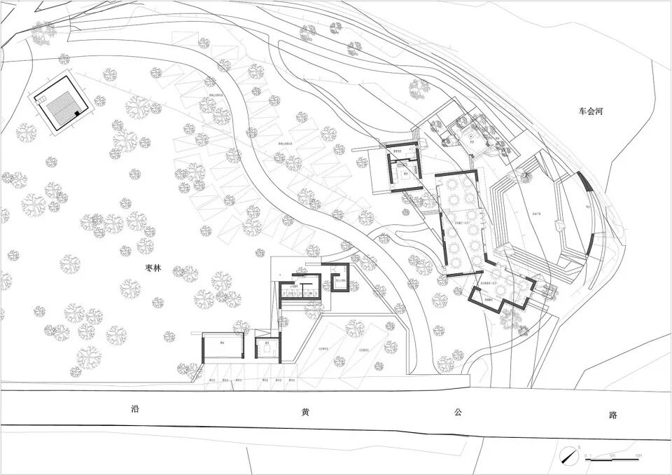 基地里成片参差不齐的枣树林,是村里的主要经济作物,每棵枣树都有自己的主人,土地的认定和赔偿也以枣树为准。在此,因地制宜地利用地形高差与林木间距,将建筑空间打散在林中成为首选策略。