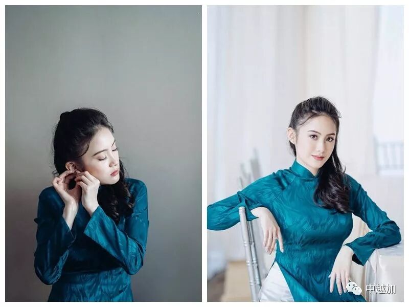 深蓝色的奥黛将她本来就白嫩的皮肤