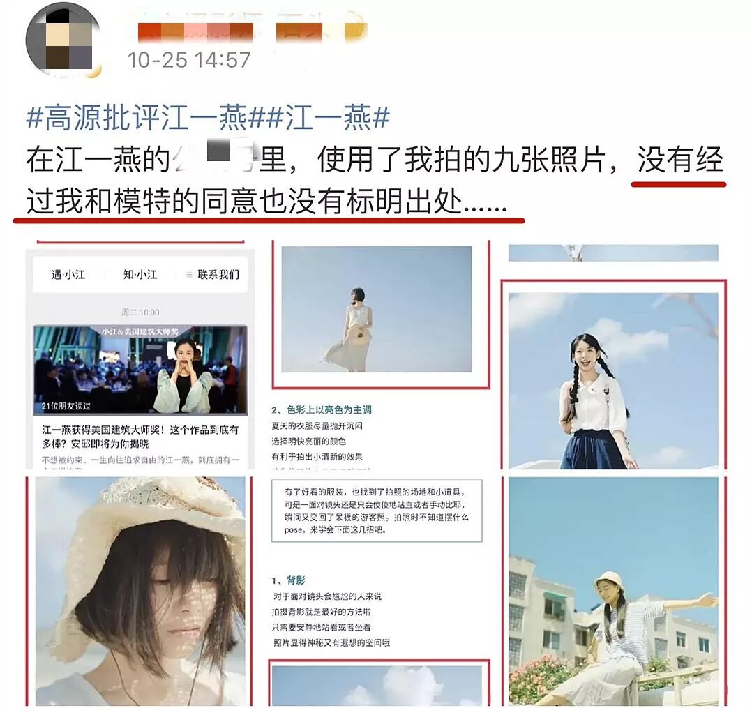 当然有做得好,也有不好,高源所说的花钱买影展,这件事无法核实暂不讨论。 但江一燕使用别人的图片没标注出处,这就是她的版权意识薄弱,带给原创作者的损失不可否认,所以这一点江一燕只能立正挨打,没有可以解释的。