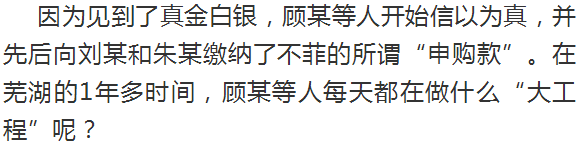 真金白银的“诱惑” 对方告诉顾某自己在芜湖有大工程,收入可观,并且前景很好。起初,顾某等人表示自己也是半信半疑。