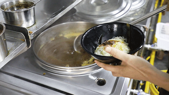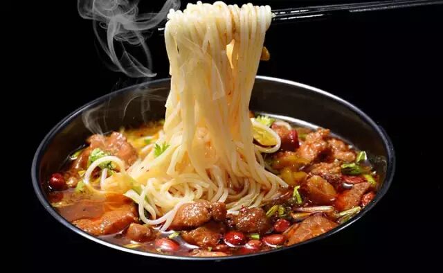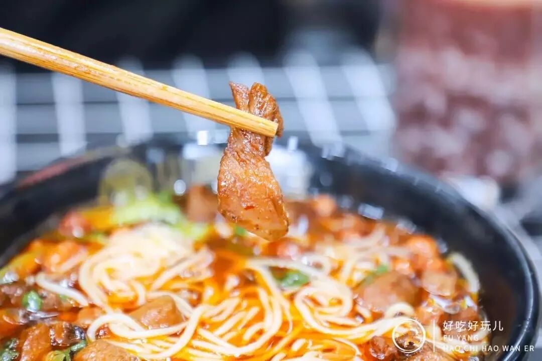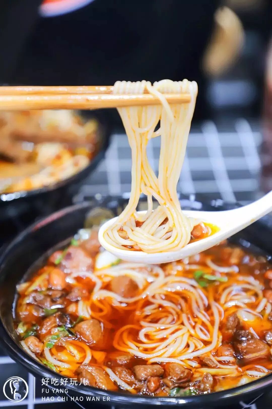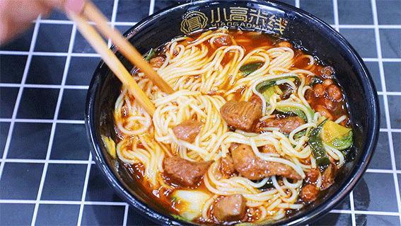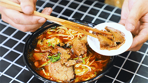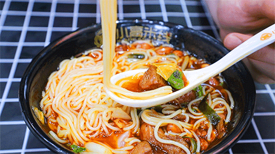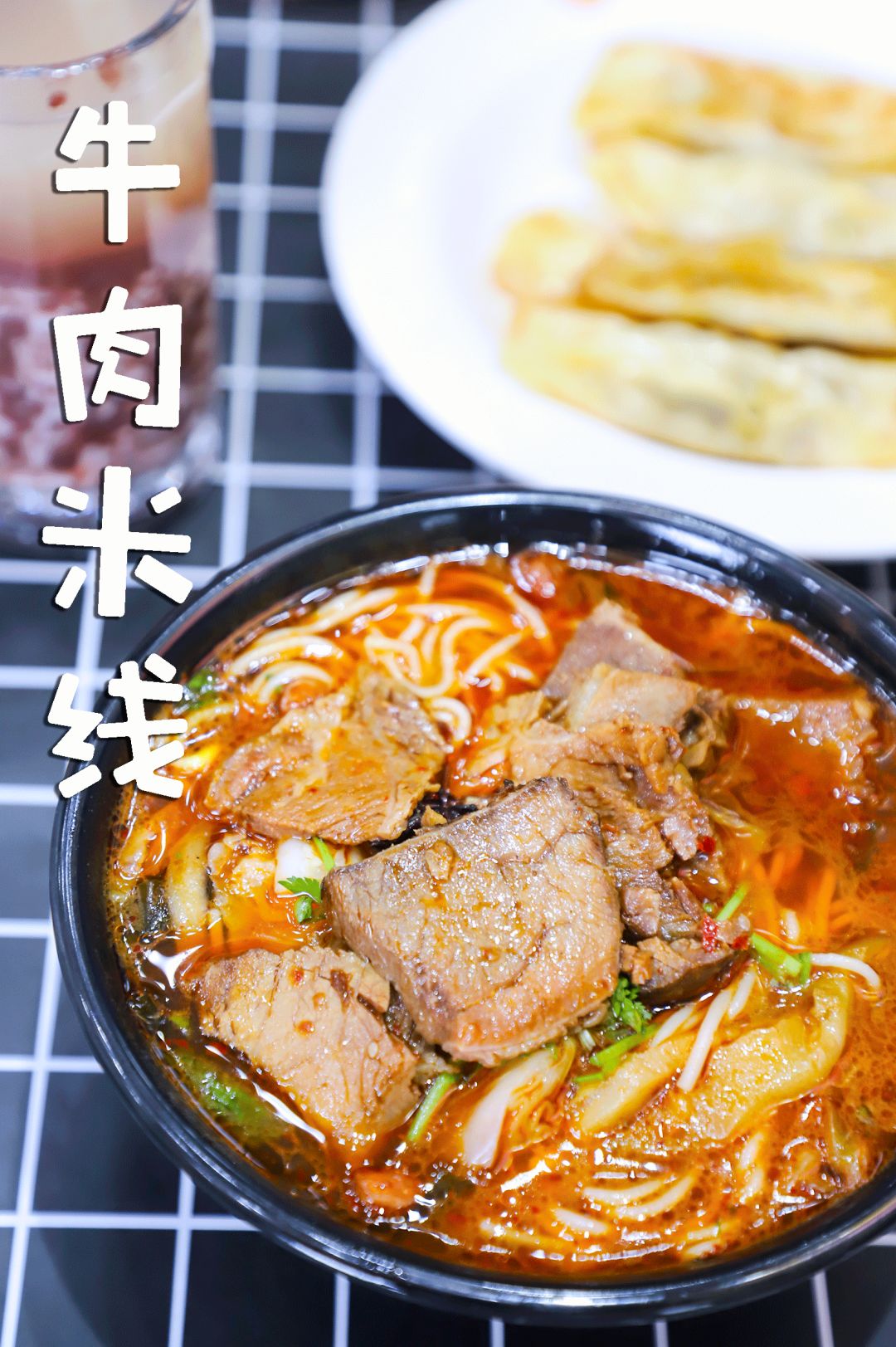 米线出锅,浇上一勺牛肉汤头,香辣鲜香的味道瞬间就溢出来了!