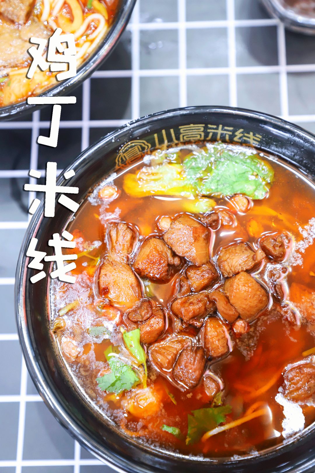 鸡丁米线香辣十足,花花亲测最佳吃法:米线+鸡丁+汤汁装满一勺,一起放入口中,特别够劲儿~